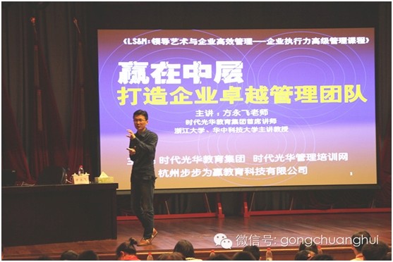 課程開始之初,方老師首先提出當(dāng)代我國(guó)企業(yè)的斷層時(shí)代全面到來(lái)。包括人文、能源、人才、干部、管理、教育等在內(nèi)的各方面都在信息高速發(fā)達(dá)的社會(huì)即將或正在面臨斷層,老板拼命學(xué)習(xí)提升,管理層在那原地踏步,你有再好的想法、點(diǎn)子,沒(méi)有好的中層一樣難以執(zhí)行,這是現(xiàn)在中小企業(yè)的通病。接著方永飛老師延續(xù)其一貫的詼諧幽默的講課風(fēng)格,通過(guò)幾個(gè)淺顯易懂的例子引出課程主題:企業(yè)的成功不僅取決于高層,中層管理者是企業(yè)的脊梁,企業(yè)的可持續(xù)發(fā)展的關(guān)鍵,80%來(lái)自企業(yè)中層的作用。企業(yè)決勝未來(lái),一定要贏在中層!
