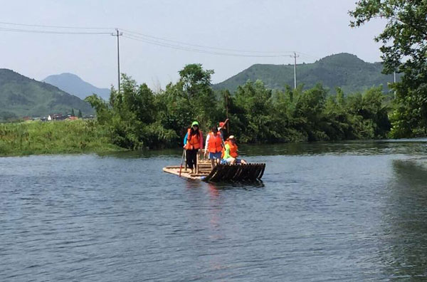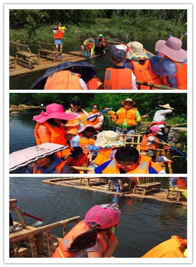 全長(zhǎng)水路3.5公里,歷時(shí)一小時(shí)左右,由專業(yè)筏工點(diǎn)篙撐筏,順莫干山、天目山支流匯合雙溪而下。溪水清澈明凈,水面時(shí)有翠鳥、鴨子等出沒,兩岸茶山蔥籠,淡竹林綿延不絕。溪邊有“苧翁垂釣”、“村姑搗衣”,實(shí)屬一幅天然水墨風(fēng)情畫,都市喧囂在此蕩然無(wú)存,令總裁們也卸下了平日繁重的工作包袱,與孩子們置身于秀美山水之間,盡情享受著天倫之樂。
