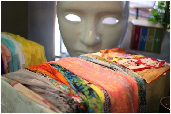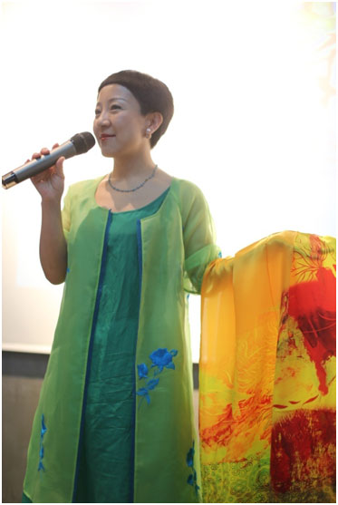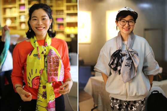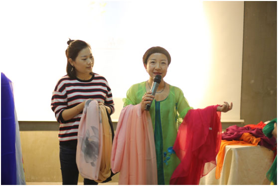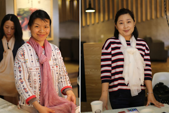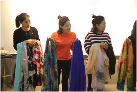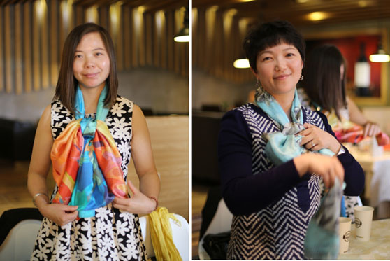 (上圖恭喜贏得競拍絲巾的女總裁:杭州莫妮服飾貿(mào)易有限公司總經(jīng)理王真真(右一)和南京蘇仕居電子商務(wù)有限公司總經(jīng)理周菁(左一)