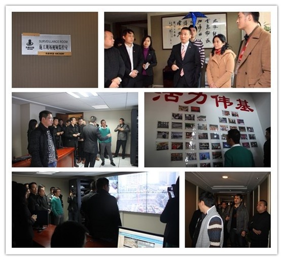 (上圖為虞董帶領(lǐng)大家參觀偉基集團。施工現(xiàn)場視頻監(jiān)控室是一大亮點,設(shè)備的先進性、科技的信息化、管理的一體化,以及對安全及進度輕松便捷的管控,都清晰明了地展現(xiàn)在眾人眼前,一目了然。一站式服務(wù)中心更是體現(xiàn)出了偉基的人性化,農(nóng)民工兄弟收工下班回來就可以在這里休息,享受五星級的服務(wù)標準,這樣的員工關(guān)懷度,套句網(wǎng)絡(luò)用語:這可真是高大上的節(jié)奏!)