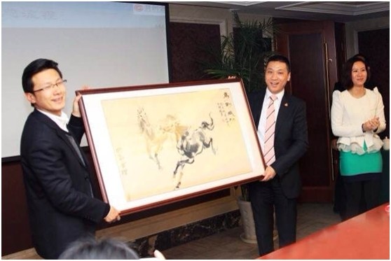 (上圖為方永飛會長代表共創(chuàng)會向偉基贈送了國畫《馬到成功》,借此祝愿偉基在馬年奮蹄揚鞭,再創(chuàng)新輝煌!)