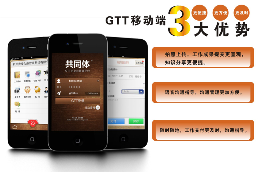 移動(dòng)互聯(lián)網(wǎng)已成為主流,更是大勢(shì)所趨,管理平臺(tái)的移動(dòng)應(yīng)用能很好的把使用者的碎片化時(shí)間利用起來(lái),隨時(shí)隨地的開展工作與管理,移動(dòng)端是移動(dòng)辦公及移動(dòng)管理的載體體現(xiàn)。針對(duì)移動(dòng)端設(shè)備具有可隨身攜帶、屏幕小、多媒體承裁的特性,GTT移動(dòng)端增加了語(yǔ)音溝通指導(dǎo)、拍照附件提交、企業(yè)"微信"等功能,讓工作與管理變的更加及時(shí)連續(xù)、便捷有效。
