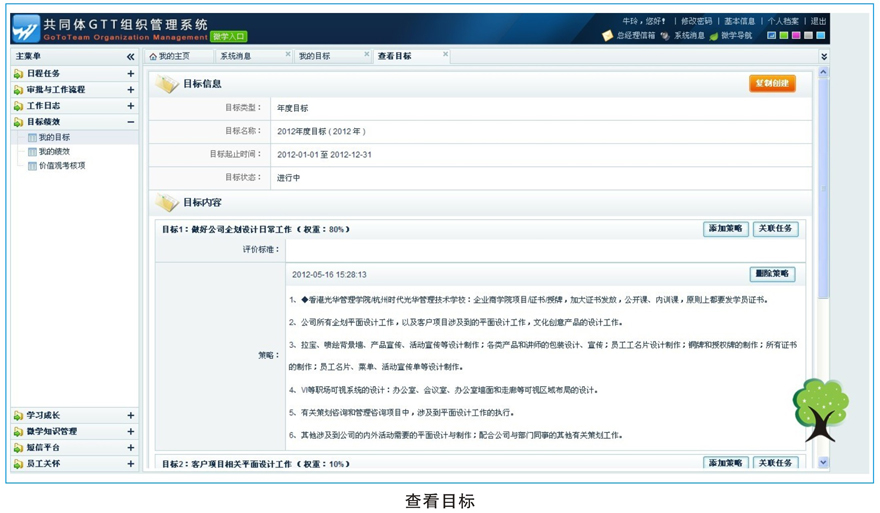 GSPDCA目標績效考核體系,是通過(1)對企業(yè)戰(zhàn)略目標的分析(G:goal,目標), → (2)找出戰(zhàn)略實施的關(guān)鍵成功因素(S strategy 策略), → (3)在此基礎(chǔ)上確定企業(yè)的關(guān)鍵績效指標等目標實施計劃(P plan 計劃),然后分解為業(yè)務(wù)單位、職能部門和個人崗位指標,通過目標的層層分解,建立起基于公司戰(zhàn)略的績效目標體系,使每個部門、崗位的努力都與企業(yè)的戰(zhàn)略目標要求相一致,將企業(yè)的戰(zhàn)略目標轉(zhuǎn)化為員工的績效責(zé)任。 → (4)通過上級向下級發(fā)布任務(wù),下級向上級提交任務(wù),同事之間協(xié)同任務(wù),任務(wù)大廳領(lǐng)取任務(wù)等方式來增加經(jīng)驗值(D do 執(zhí)行),提升自我的價值和增進員工之間的默契。 → (5)提交任務(wù)執(zhí)行反饋、工作日志,最后領(lǐng)導(dǎo)通過檢查指導(dǎo)(C check 檢查), → (6)其中需要修正的,及時反饋于下屬修正完善(A action 修正),直至完成目標。