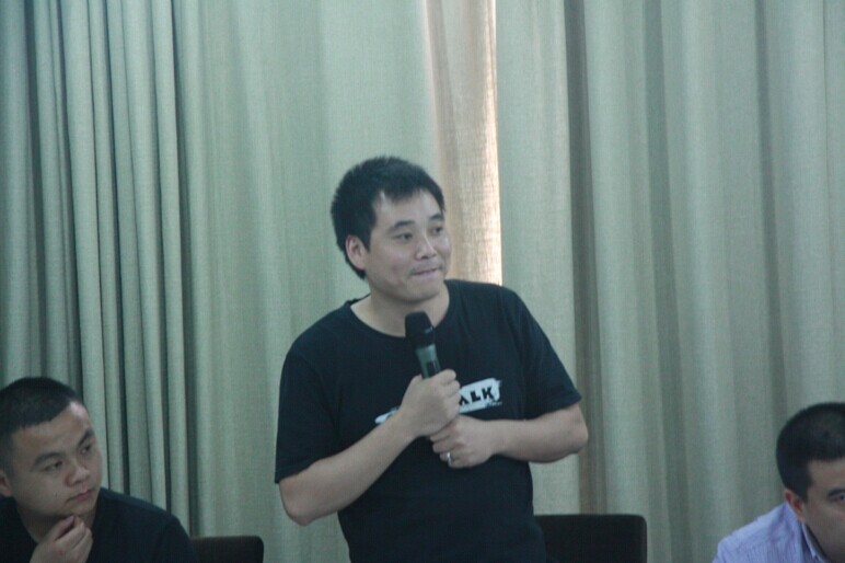 (上圖為共創(chuàng)會會員浙江天喜網(wǎng)絡科技有限公司李總正在提出“以老板為核心的企業(yè)管理模式會不會使員工感到反感”問題。)