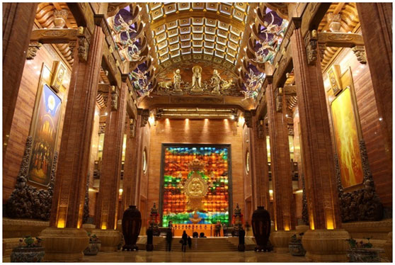 共軍們學(xué)習(xí)完大佛文化,靜靜地進(jìn)入清凈莊嚴(yán)的靈山梵宮正廳。前后瞻望,只見(jiàn)整個(gè)大廳一派氣勢(shì)恢弘,金碧輝煌,令人驚嘆不已。來(lái)到百米廊廳,抬望南立面的墻上,是中國(guó)書法協(xié)會(huì)副主席言恭達(dá)先生的巨幅隸書,整幅作品采用刻漆工藝制作成書法壁畫,長(zhǎng)10.18米,寬4.34米,內(nèi)容是禪宗六祖慧能的 《六祖壇經(jīng).定慧品》第四節(jié)的節(jié)選,總計(jì)379字。