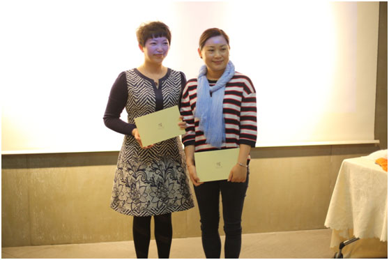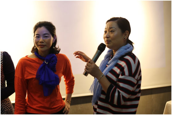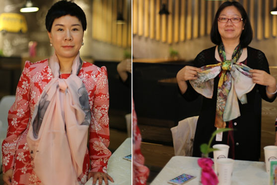 (上圖恭喜贏得競拍絲巾的女總裁:杭州莫妮服飾貿(mào)易有限公司總經(jīng)理王真真(右一)和南京蘇仕居電子商務(wù)有限公司總經(jīng)理周菁(左一)